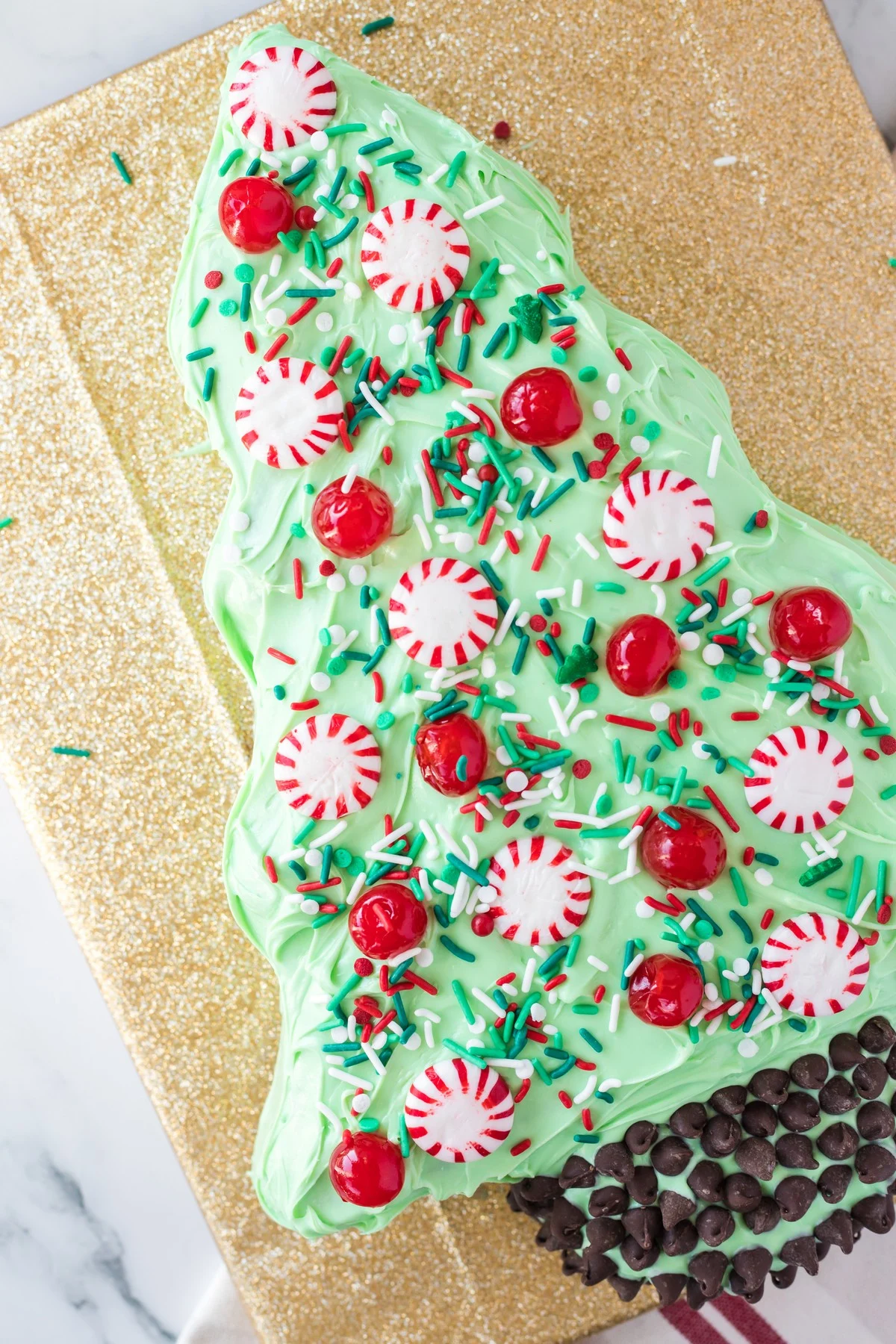Kick off your holiday festivities this year by making a Christmas tree cake. Not only is this recipe simple to make, but it’s a great way to create an annual tradition with the family. Tender and moist chocolate cake is decorated with festive sprinkles, maraschino cherries, peppermints, and a chocolate chip trunk.