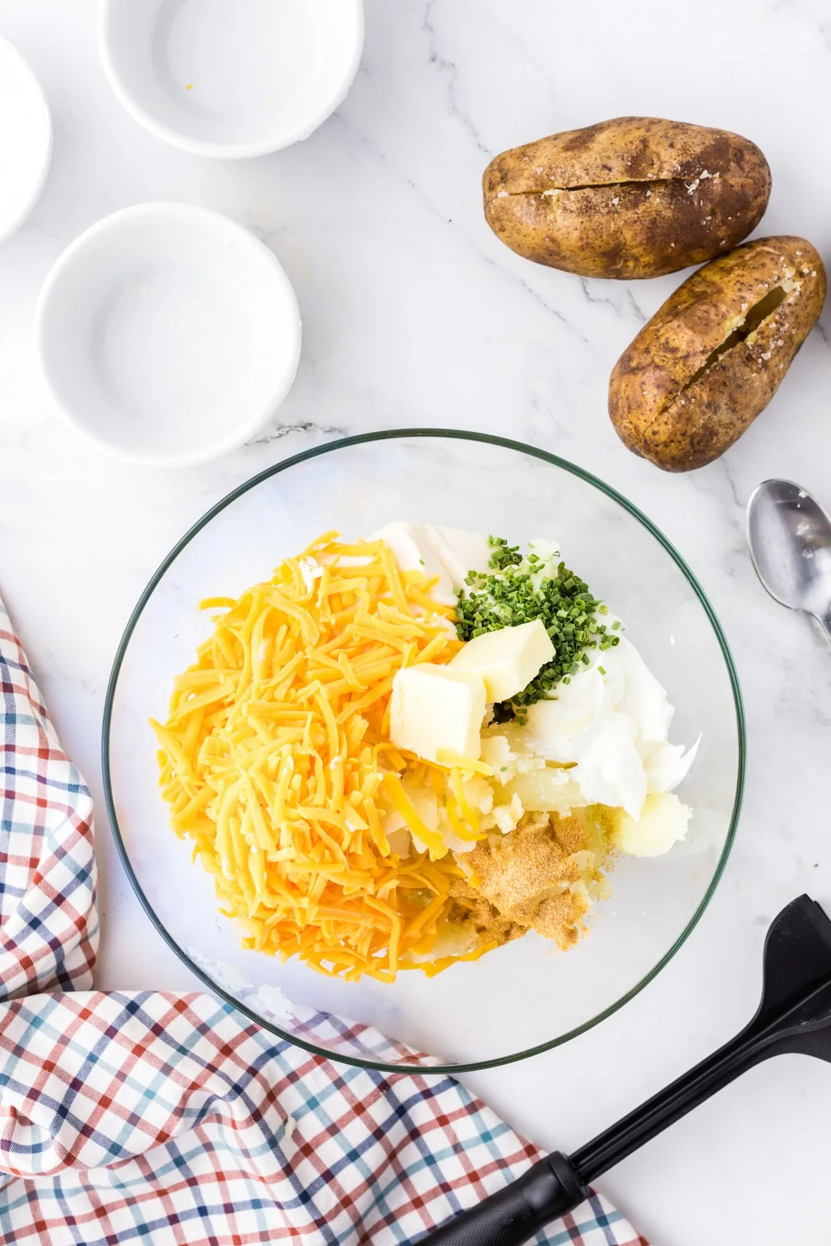 - To make the potato filling, mash the potato insides with the butter, mayonnaise, sour cream, cheese, garlic powder, and chives to the mixing bowl.