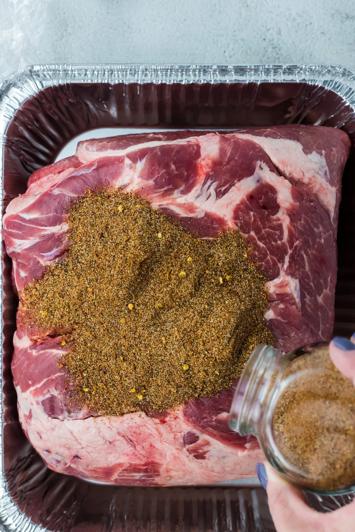 Place your defrosted pork shoulder on a clean workspace. I recommend rubbing, marinating, and cooking in the same container. Try a disposable aluminum pan for easy clean up.