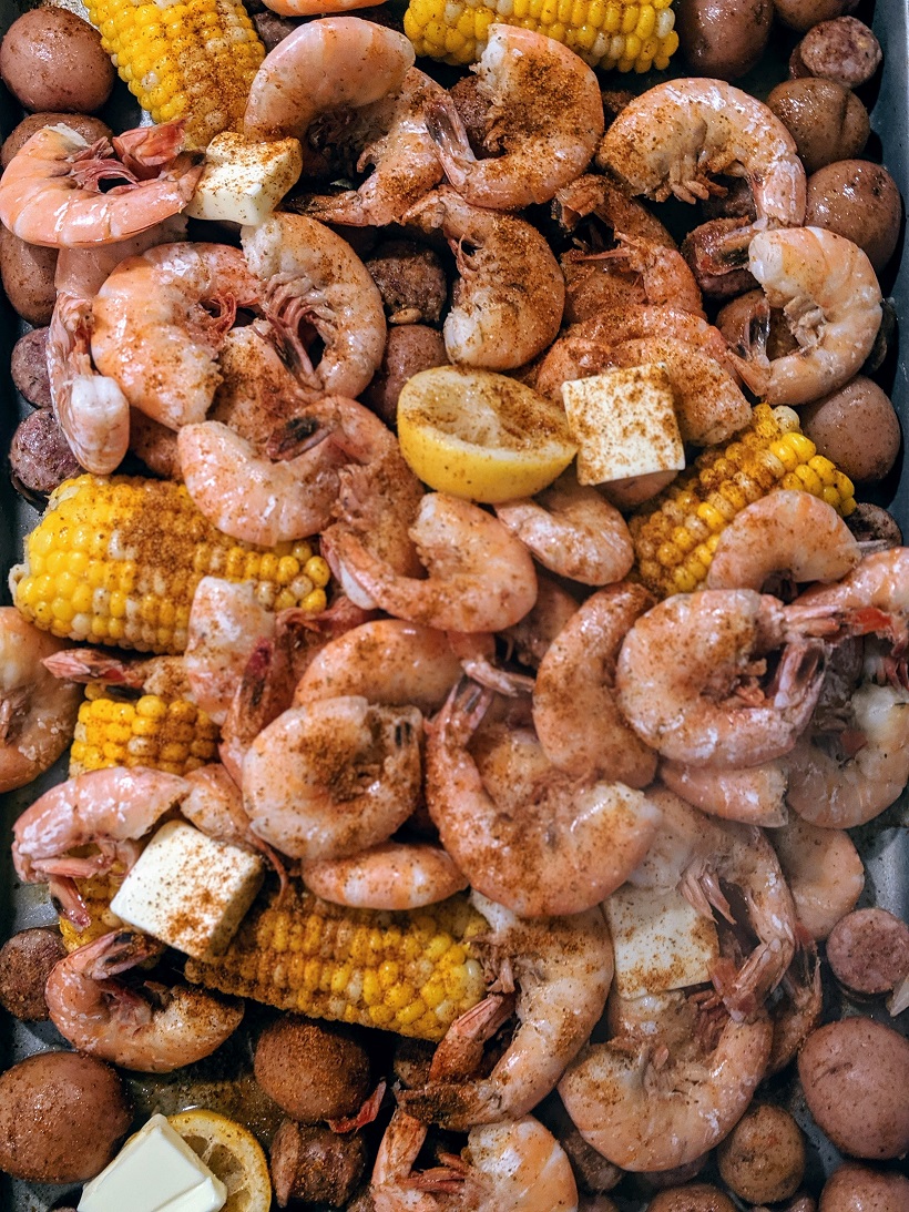 Step 3: Add butter and Old Bay seasoning to the top of the sheet pan ingredients. Return to oven and bake for 8-10 more minutes.